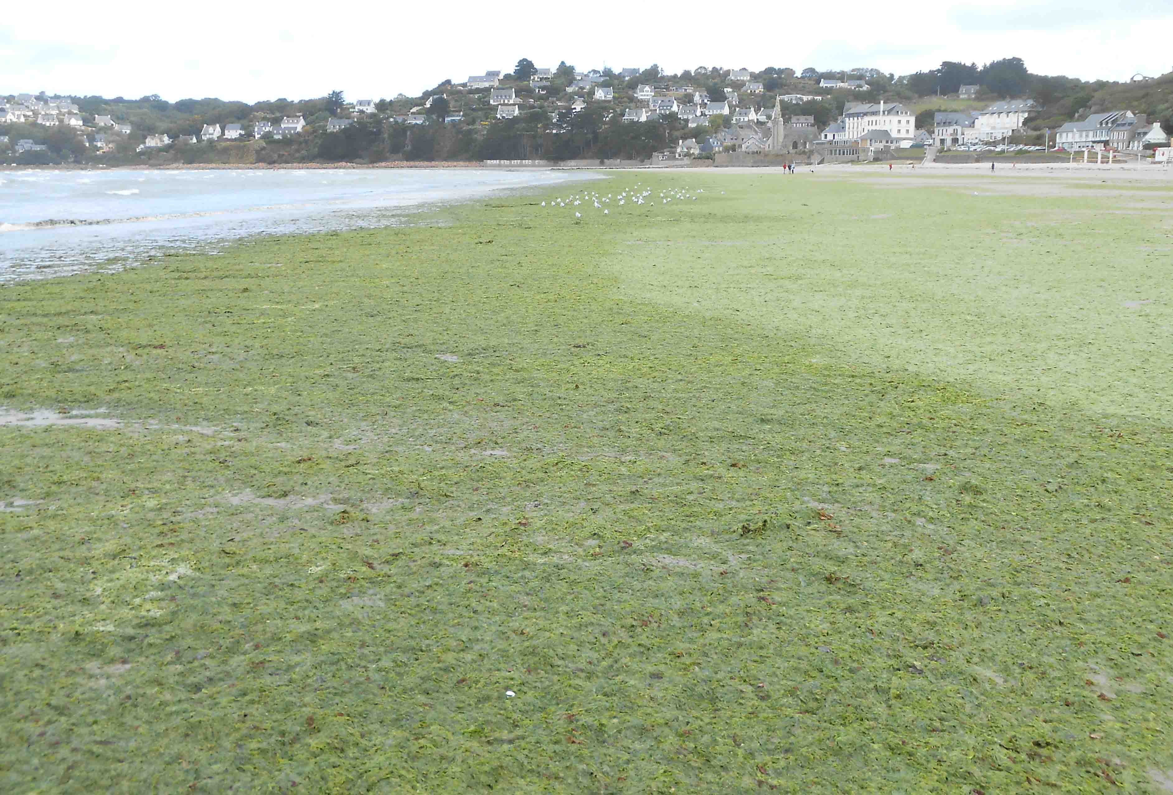 Cela se produit lorsque l’oxygène dissous est consommé plus vite qu’il ne se reconstitue, en particulier près des lieux où la vie foisonne. La décomposition de nombreux organismes morts et déjections diminue la teneur en oxygène, et une partie des résidus a le temps de gagner le fond de l’eau et de se mêler aux sédiments avant d’être complètement dégradée. Nous pouvons même voir ce phénomène en surface, dans les lacs, rivières et mers frappés d’eutrophisation dû à l’épandage excessif d’engrais dans les champs. Le phytoplancton et les algues prolifèrent puis finissent par mourir. Croulant sous l’abondance de nourriture, les bactéries dégradent à tout va, consument l’oxygène dissous. Il n’en reste rien pour les êtres aérobies ; ceux-ci suffoquent, les poissons se retrouvent le ventre à l’air. Et la décomposition des cadavres aggrave l’anoxie et amplifie les hécatombes. Depuis quelques décennies, la Bretagne est victime de marées vertes qui s’abattent chaque année sur les plages et dissimulent le sable sous une couverture flasque et luisante d’algues que les gens connaissent sous le nom de laitues de mer (Fig. 1). Les touristes fuient ces vastes étendues inesthétiques et malodorantes. En pataugeant dans cette salade, ils crèvent la croute de vase et de tissus végétaux faisant écran à l’air, et libèrent les mauvaises odeurs typiques de la décomposition anaérobie qui consomme le cœur des masses échouées. Bien que moins visibles, de vastes zones mortes, désertées par les poissons, s’étendent aujourd’hui sous les mers, rendues anoxiques par les activités humaines.